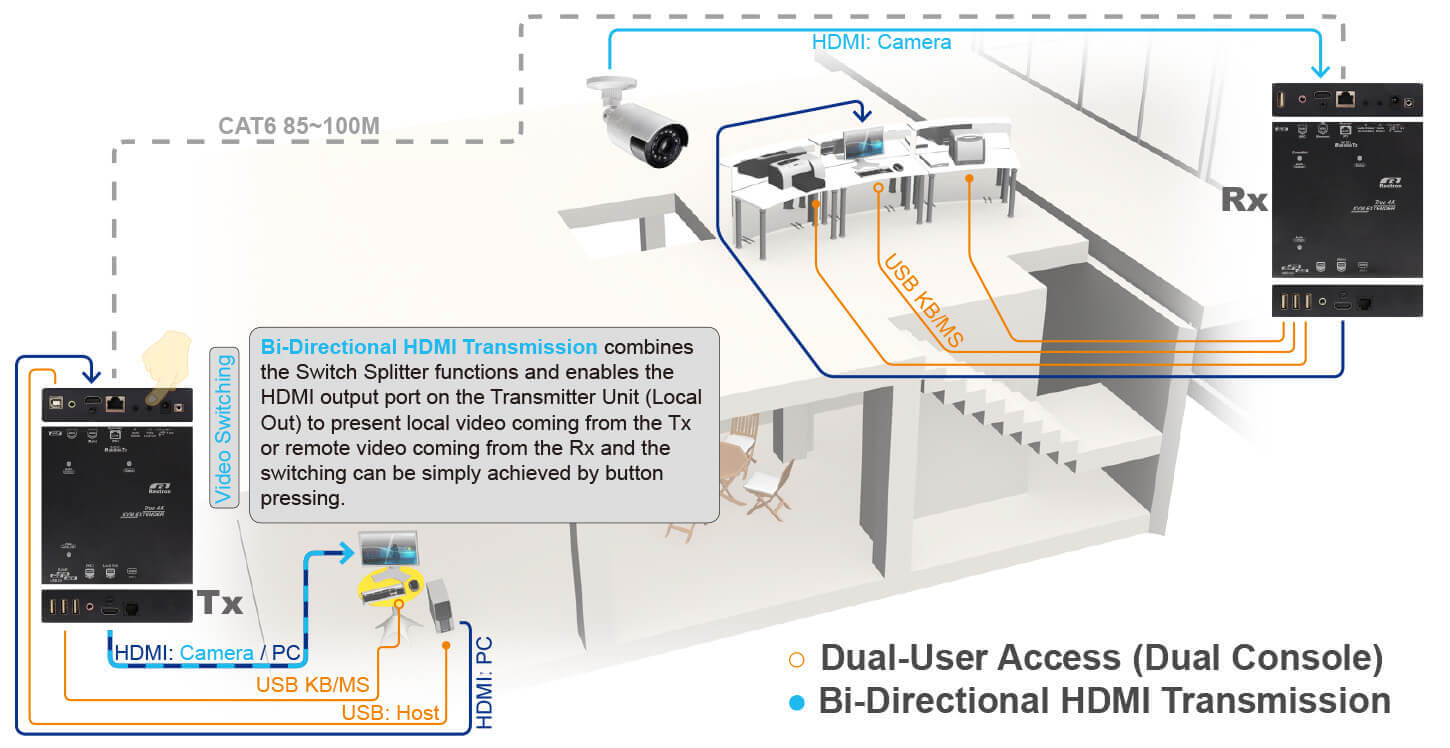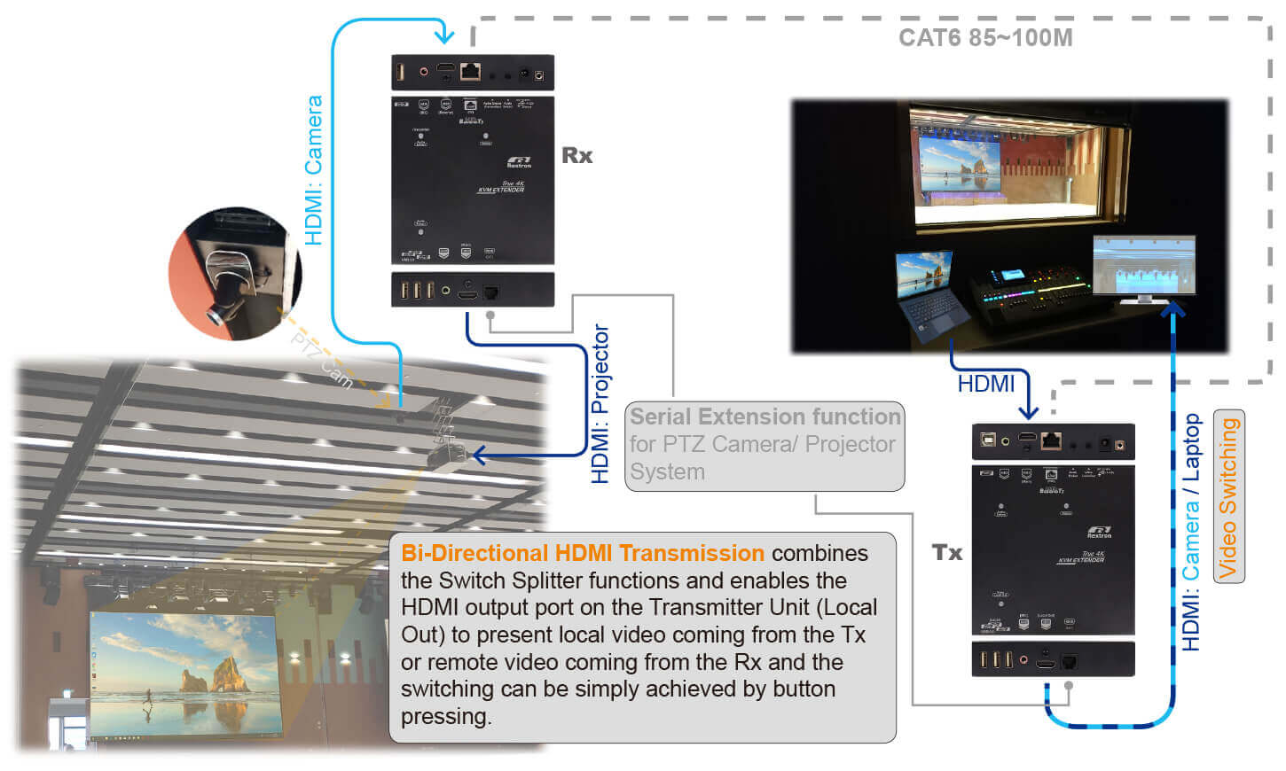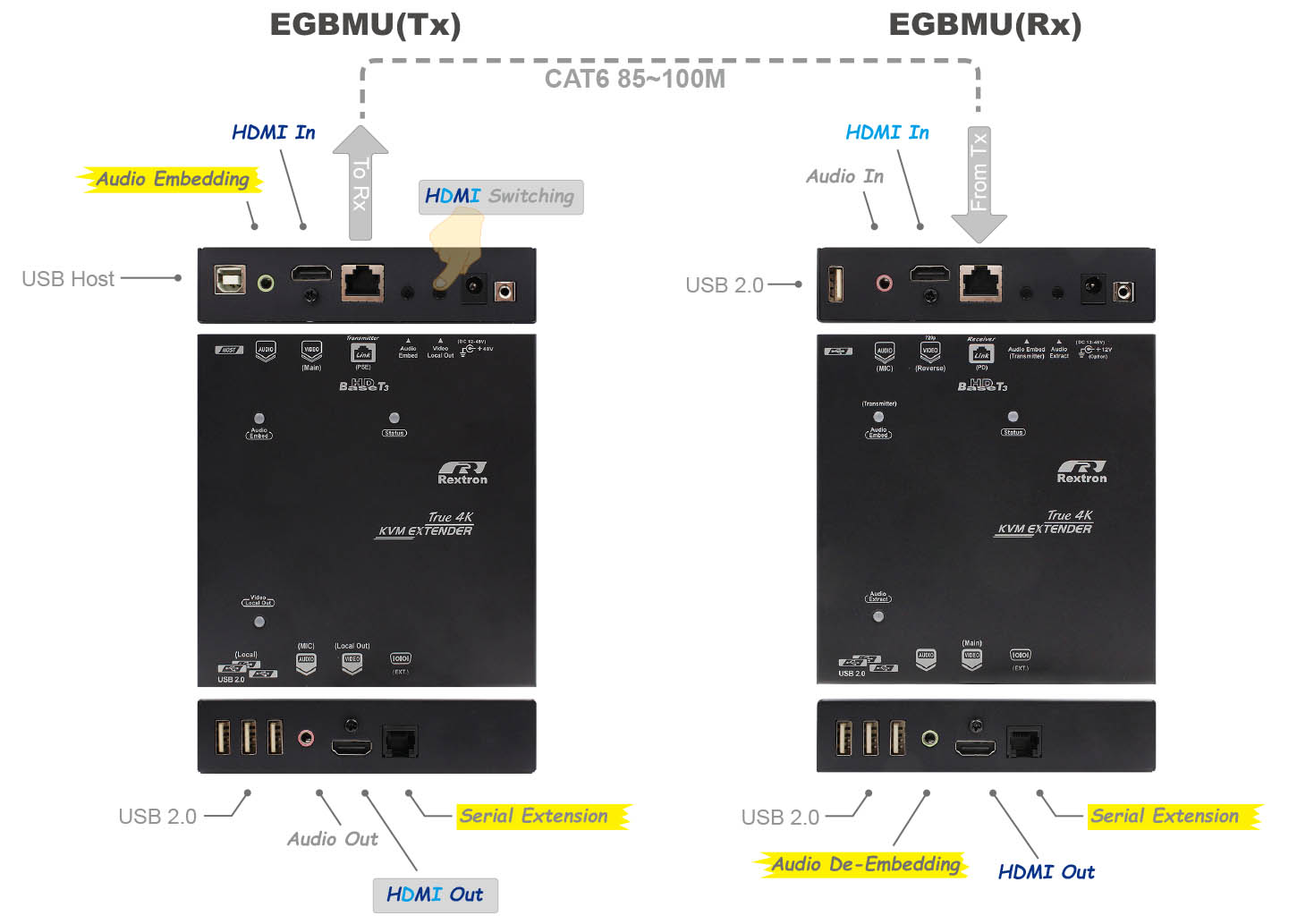 HDMI USB Extender over CAT-6A, True 4K HDBaseT 3.0 KVM Extender with Audio, Serial, and USB, EGBMU-M3210 offers uncompressed 18G HDMI 2.0 extension capability to transmit uncompressed 4K 60Hz (4:4:4) video through single CAT-6A or CAT-7 cable up to 90 meters. Bi-Directional HDMI Transmission combines the Switch Distributor functions and enables the HDMI output port on the Transmitter Unit (Local Out) to present local video coming from the Tx or remote video coming from the Rx and the switching can be simply achieved by button pressing. The local/remote video switching function offers a better visibility and allows local users to monitor the HDMI signals coming from both sides or broadcast HDMI signal on both local (Sender) and remote (Receiver) unit concurrently.