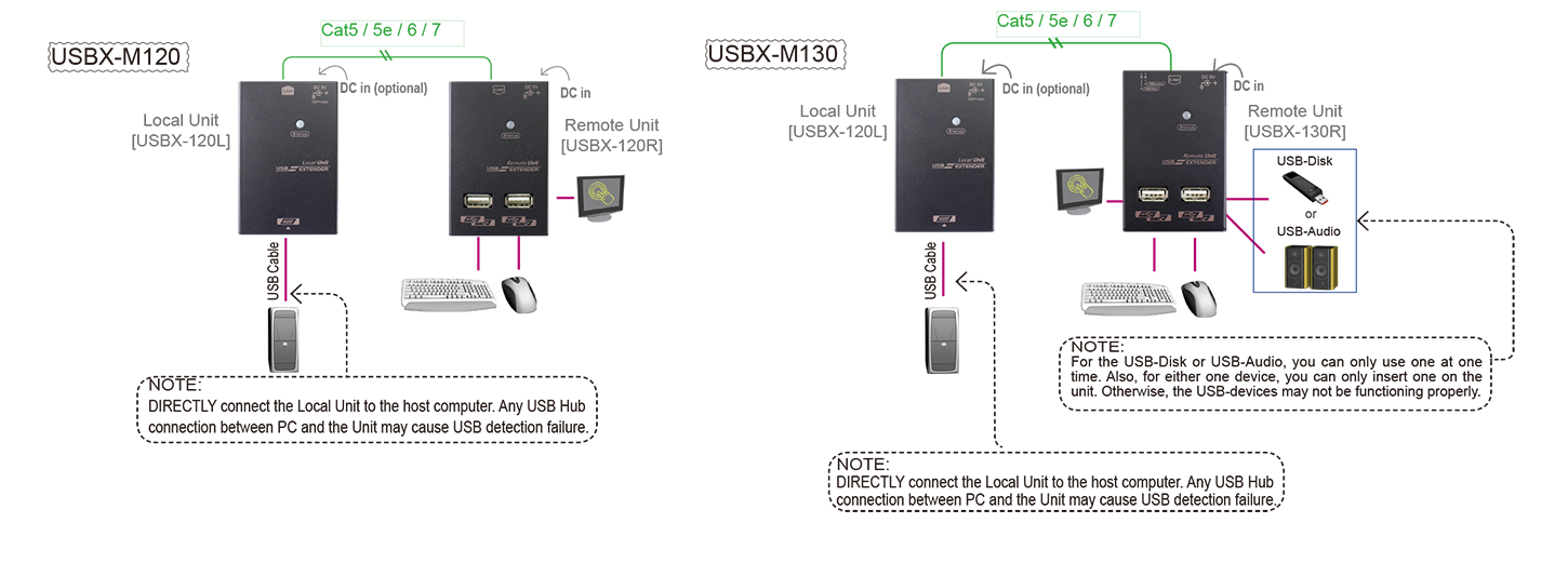 USB 1.2 Extender, USBX-M130, consists of a transmitter and a receiver unit. Unique mechanism design provides two USB-A ports on top and two USB-A ports mounted on side of the unit for easily USB peripherals connecting suitable for both long-term and temporary USB peripherals access and allows users to attach or detach USB devices with ease. Tx side power supply is not required when the transmitter unit can draw sufficient power from the Host Device (PC/ Laptop).