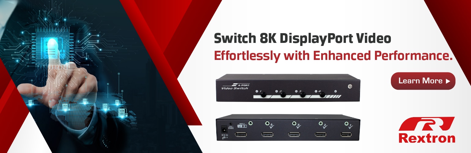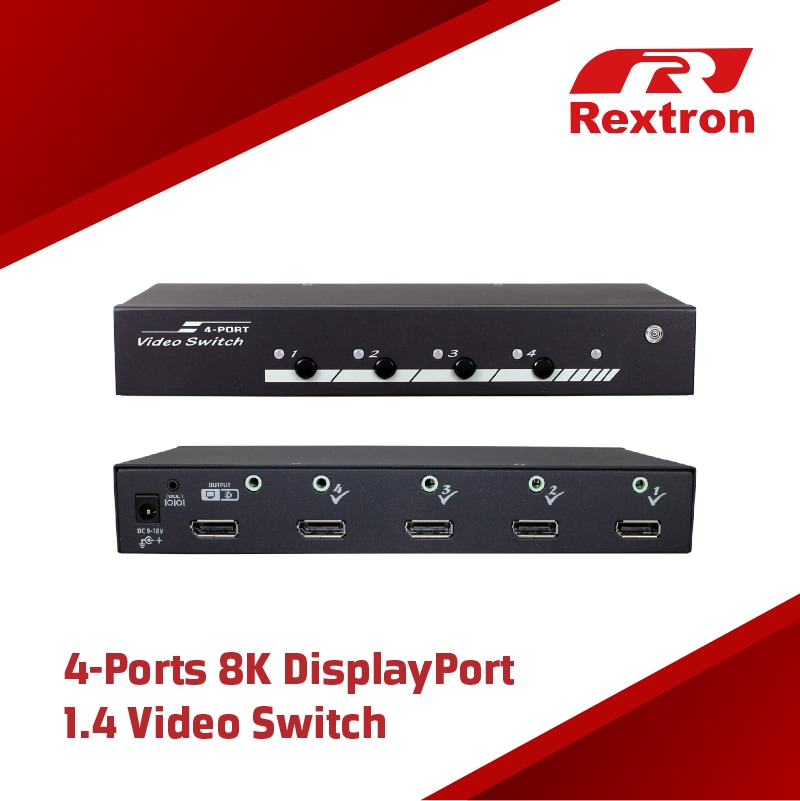 Choose the 4-ports 8K DisplayPort 1.4 Video Switch from Rextron International Inc. for unparalleled video switching capabilities. Experience high-resolution visuals and flexible control options, perfect for professional and entertainment environments.